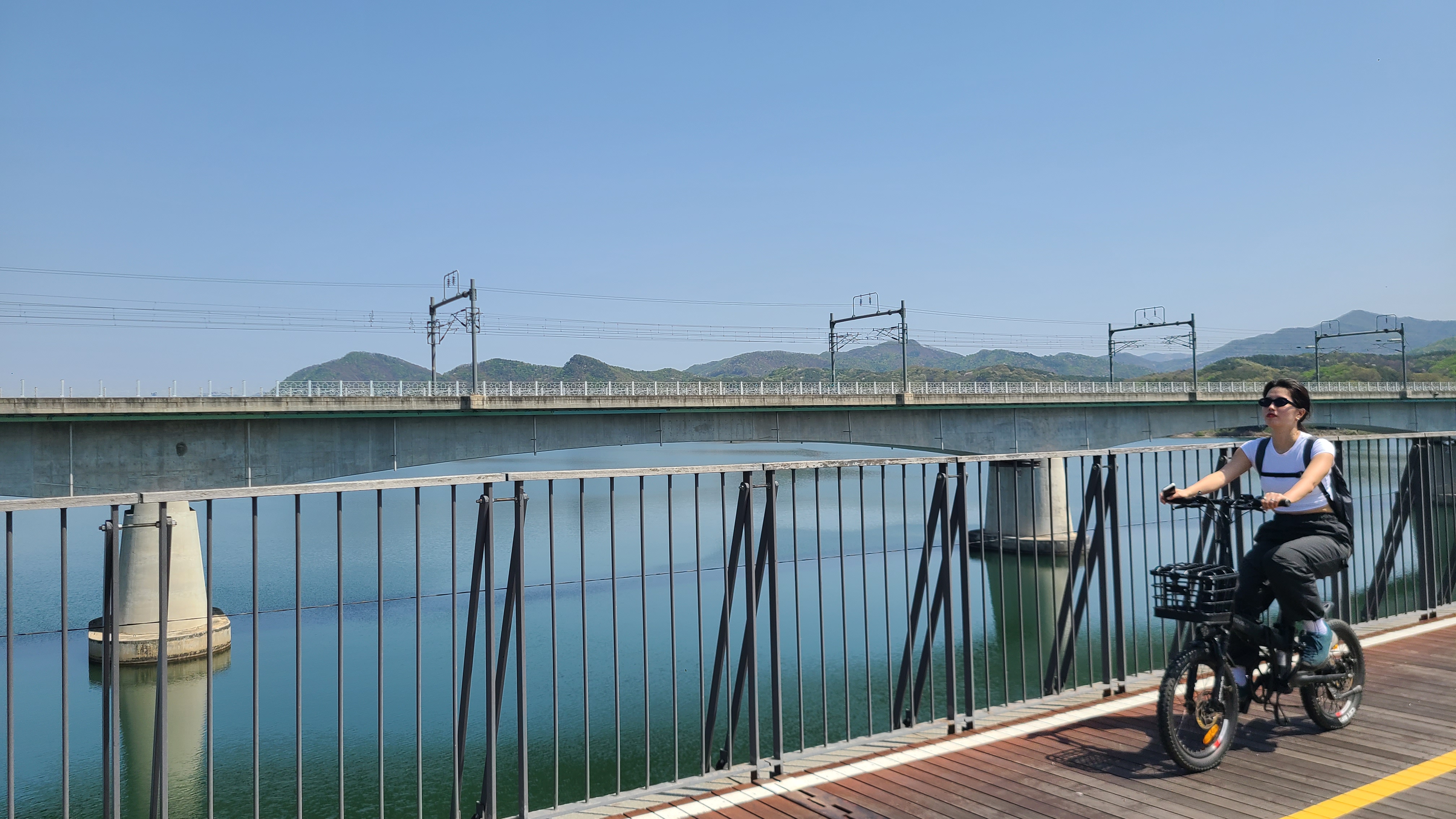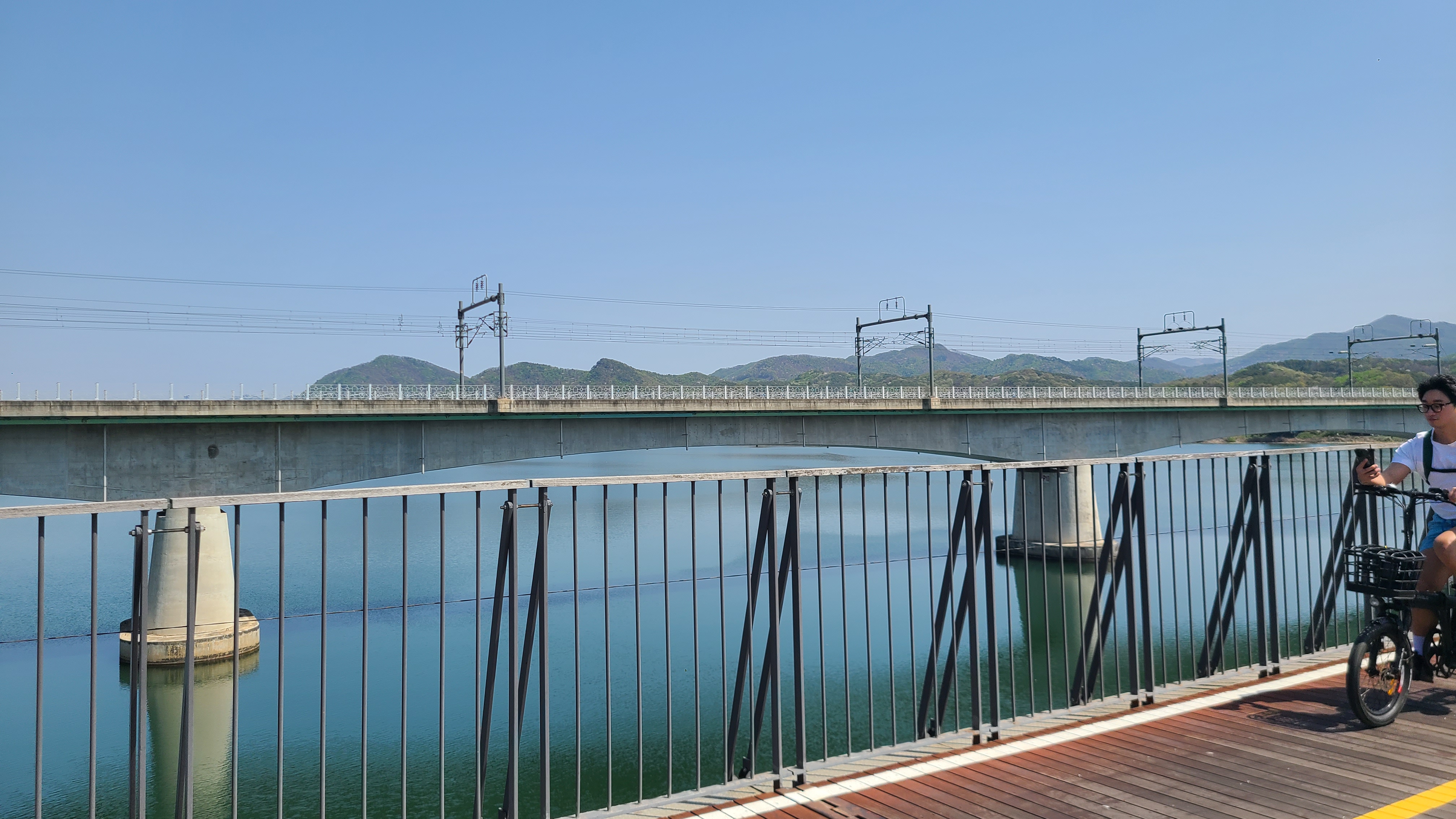 북한강철교위에서 양수리 쪽에 눈길 한 번 주고...