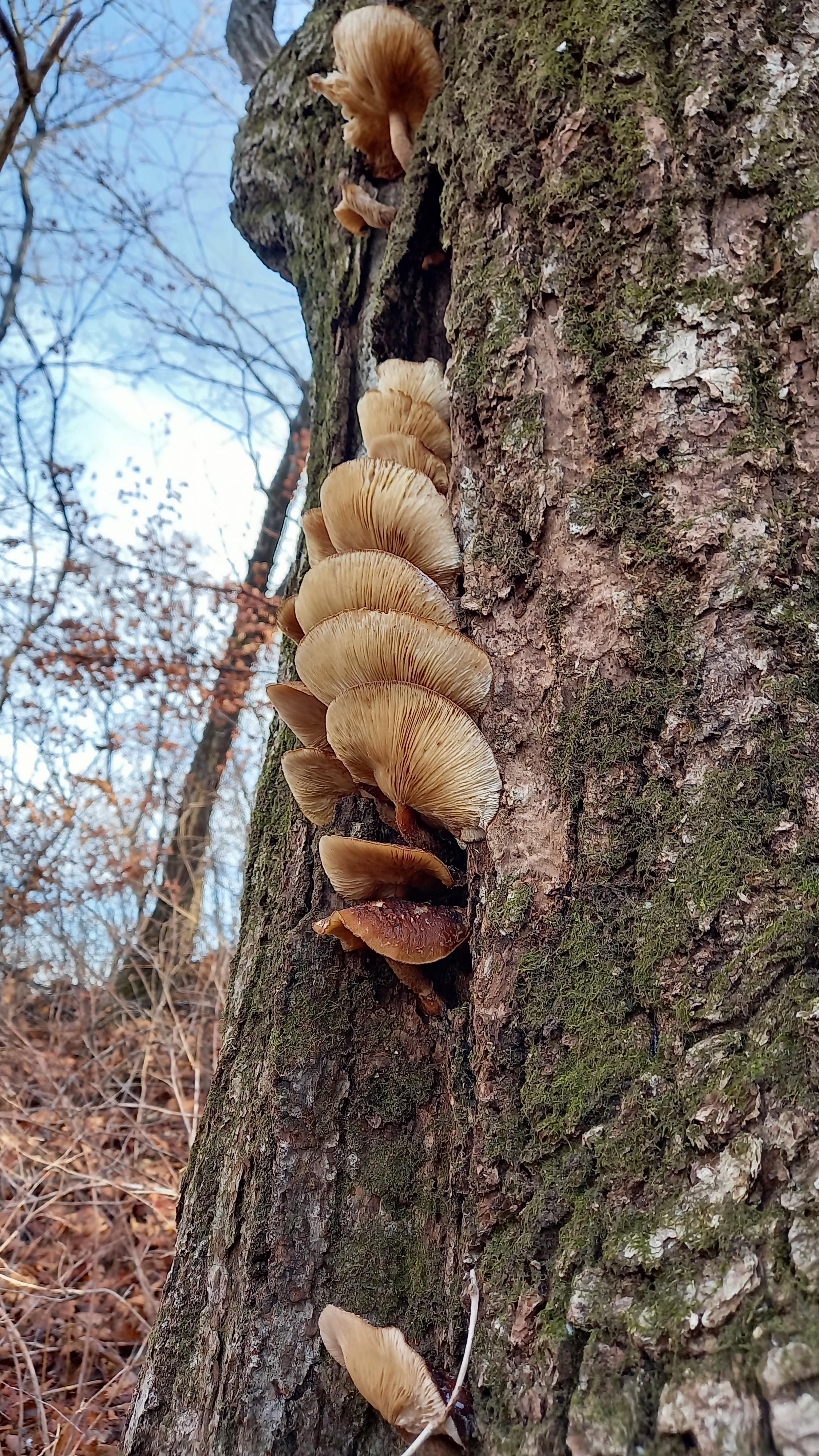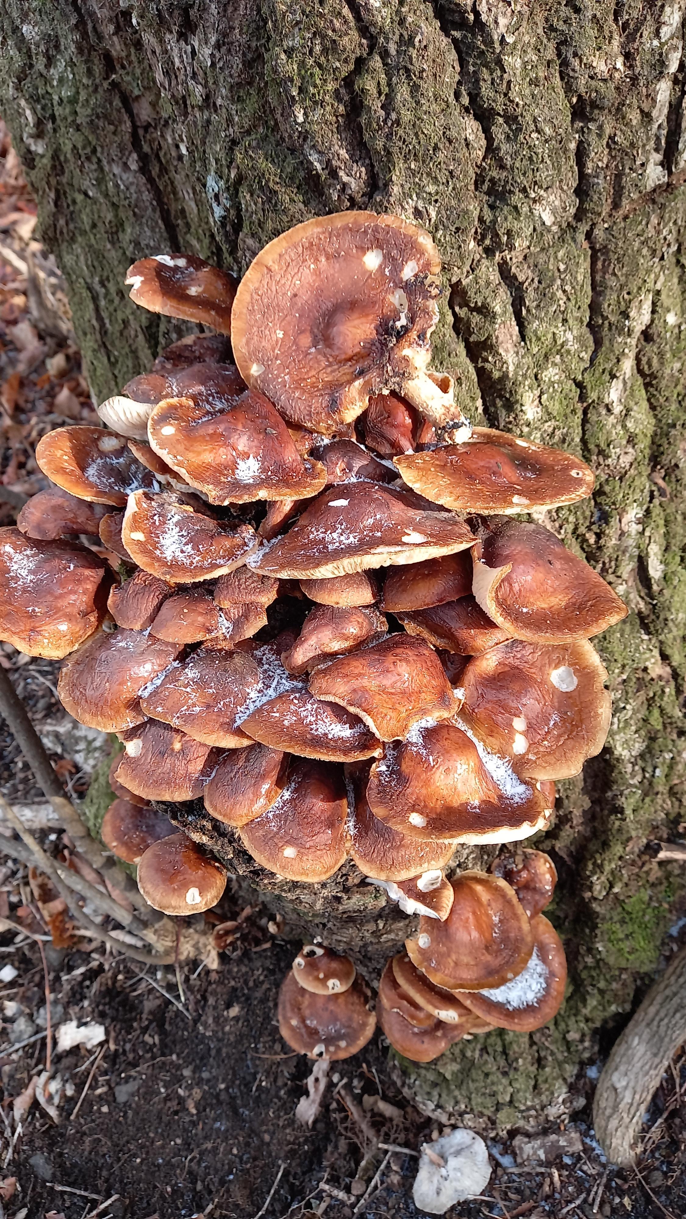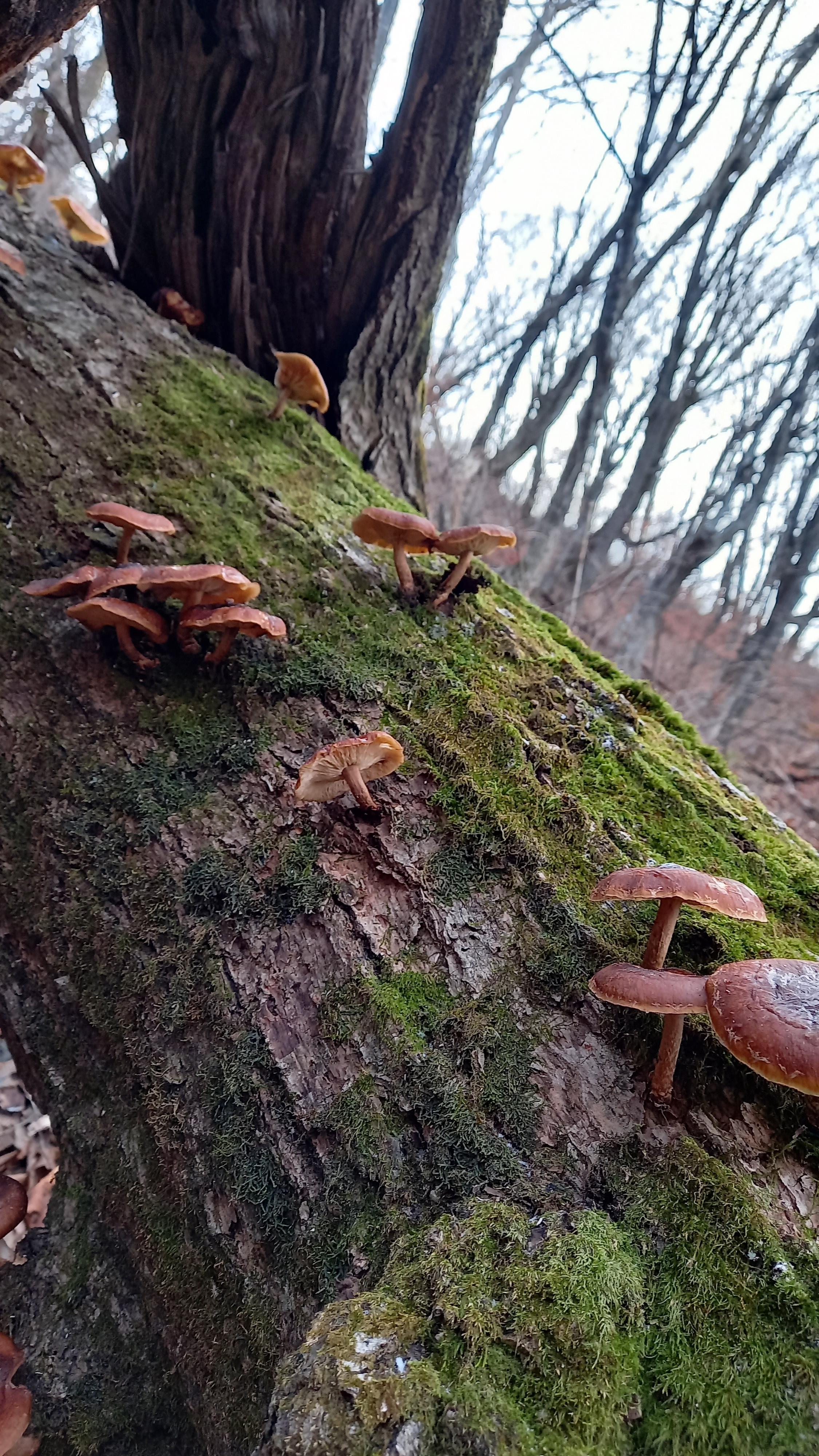 엄청 큰 참나무에 표고버섯이 붙어 있습니다.