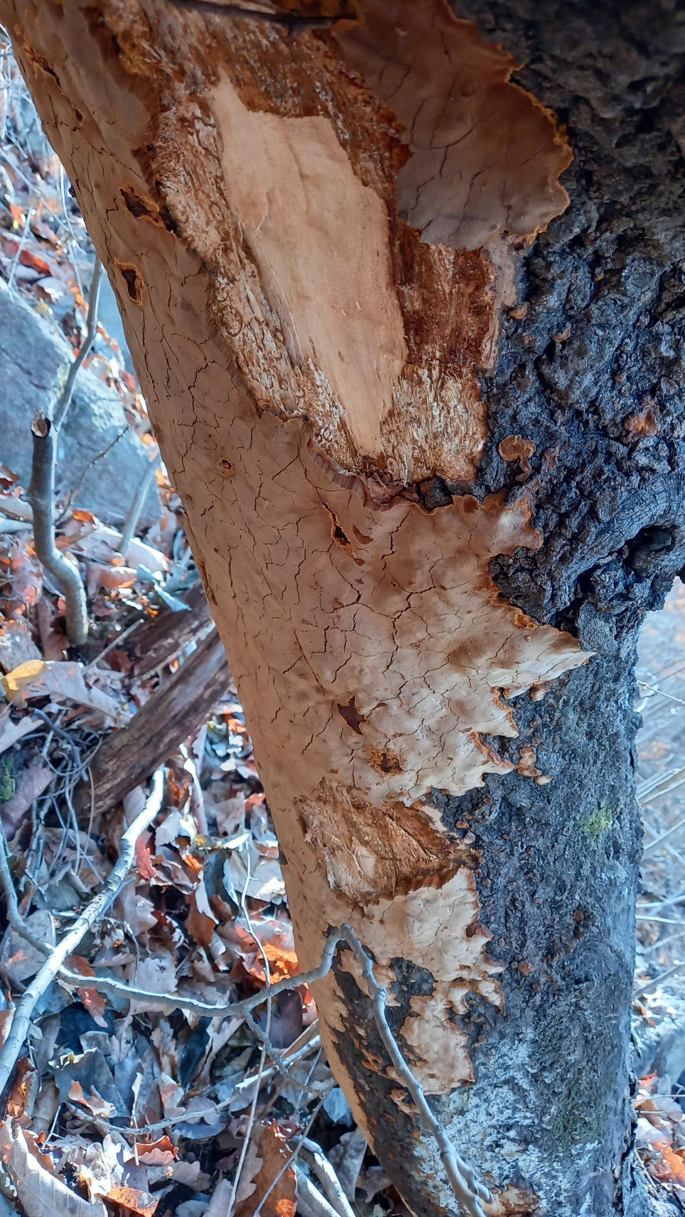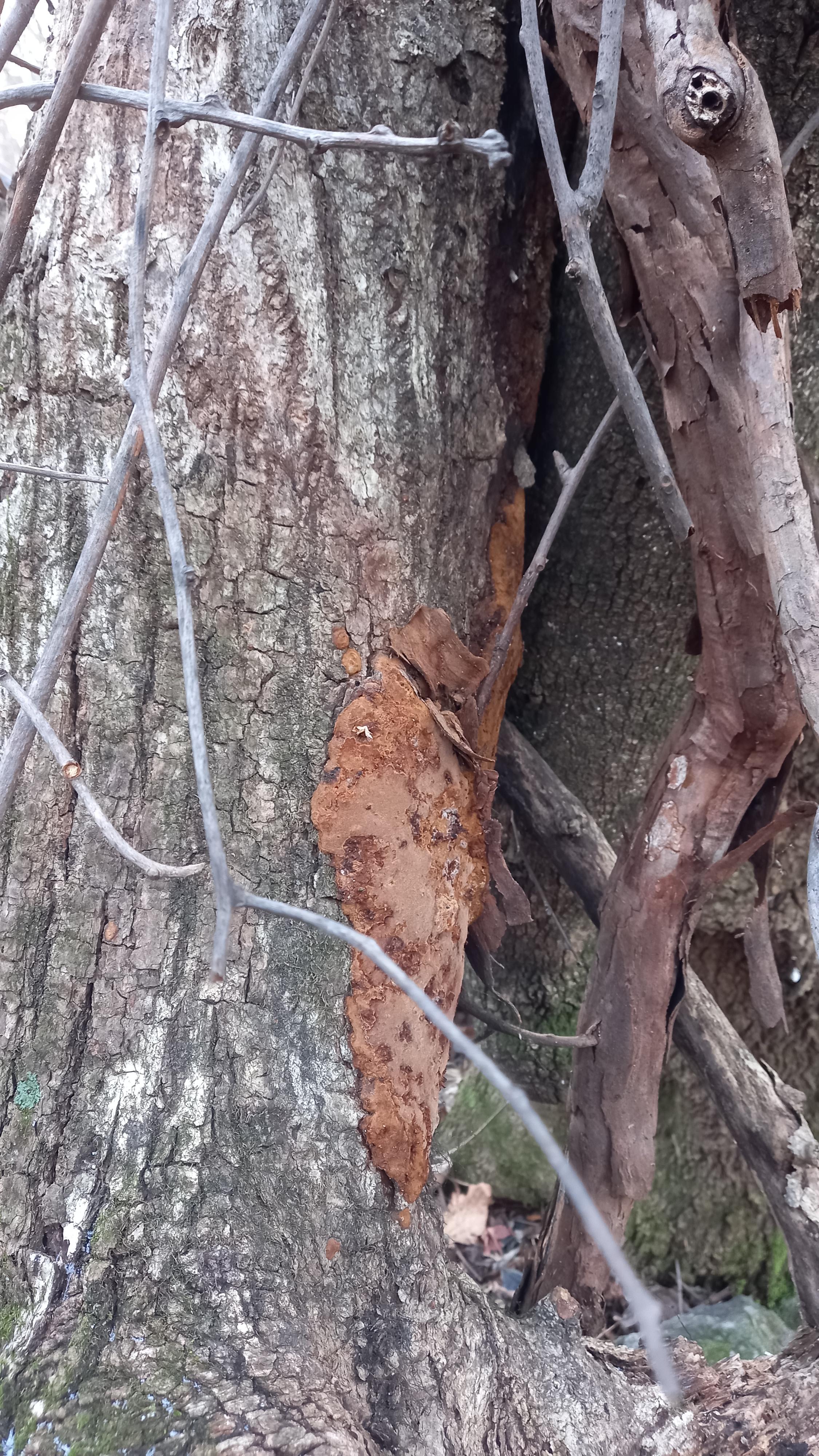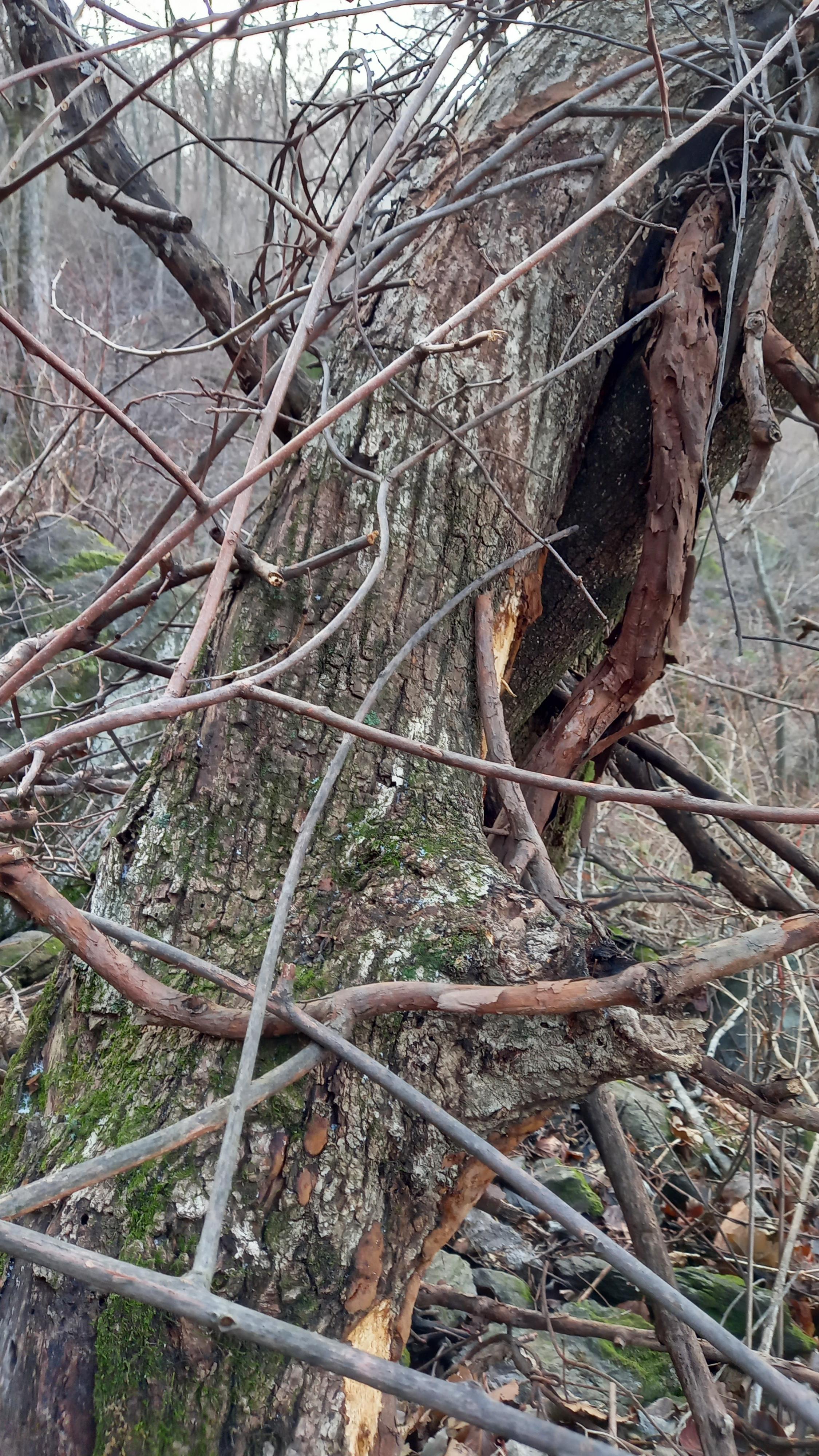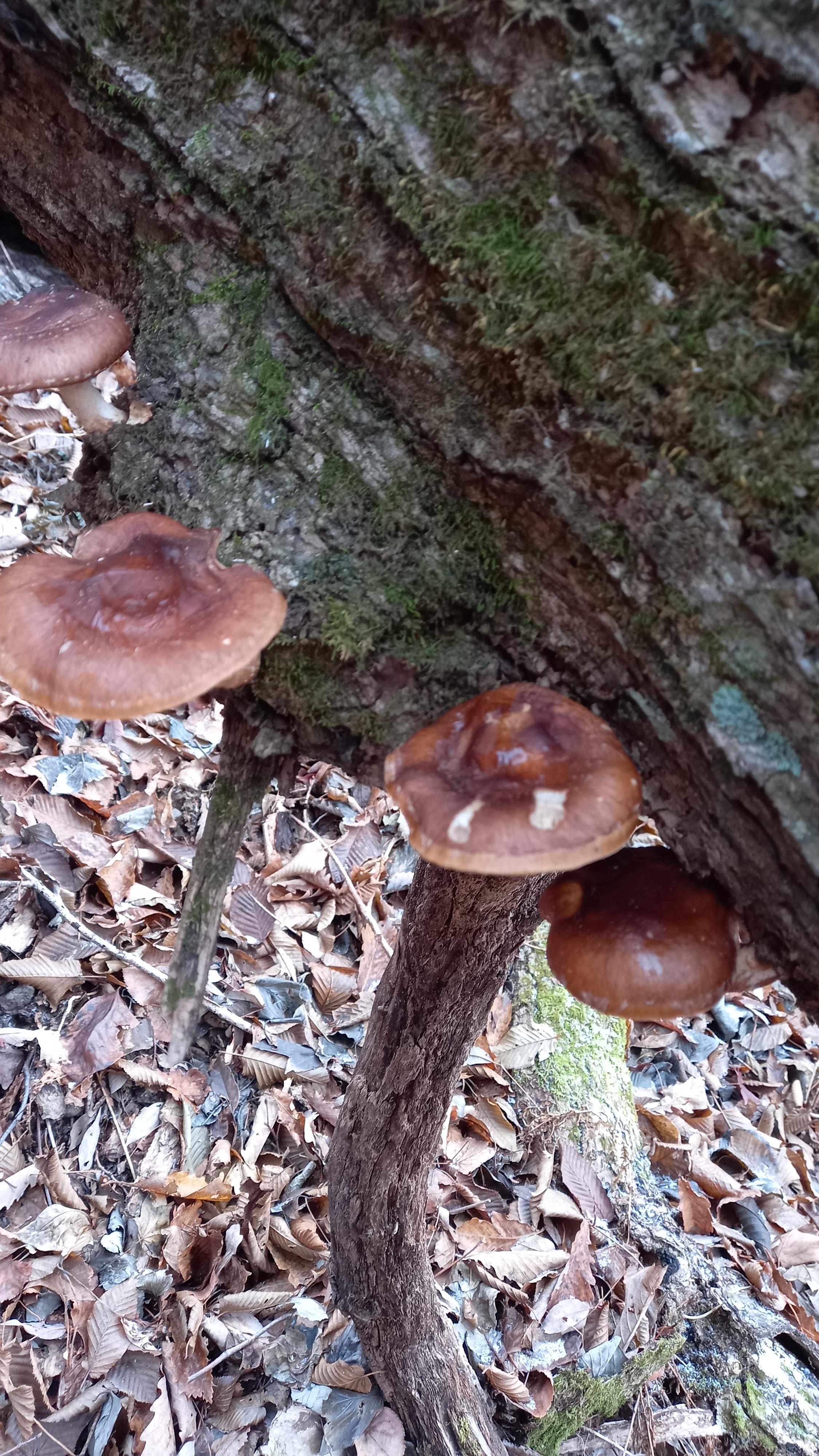 엄청 큰 참나무에 표고버섯이 붙어 있습니다.